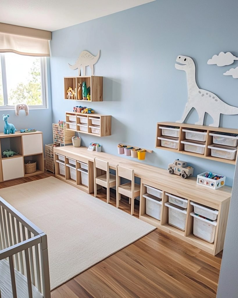 This playroom brings prehistoric charm with a dinosaur-themed craft corner. The light blue walls adorned with whimsical dinosaur cutouts create a playful backdrop, while a long wooden desk offers ample space for art projects.