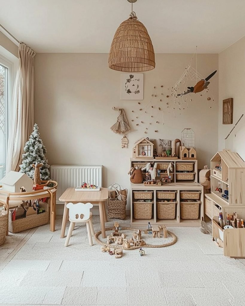 A warm, wooden play haven invites children to explore with its natural aesthetic. Wooden shelves with woven baskets provide clever storage for toys, while a small table with animal-shaped chairs encourages imaginative play. The space is adorned with a woven pendant light and a mini Christmas tree, adding a festive touch.