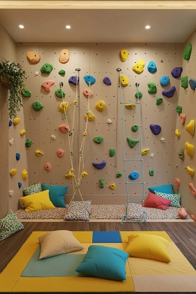 A mini climbing wall with colorful holds encourages physical activity. A rope ladder adds challenge, while cushioned mats ensure safety. Neutral walls and vibrant cushions create a cozy, adventurous retreat for kids to climb and play.