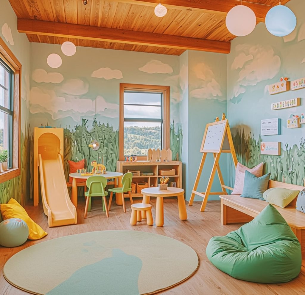 This playroom transports kids to a dreamy world with cloud-painted walls and a nature-inspired mural. A small slide adds a touch of adventure, while a round table with colorful chairs invites group activities like drawing or games.