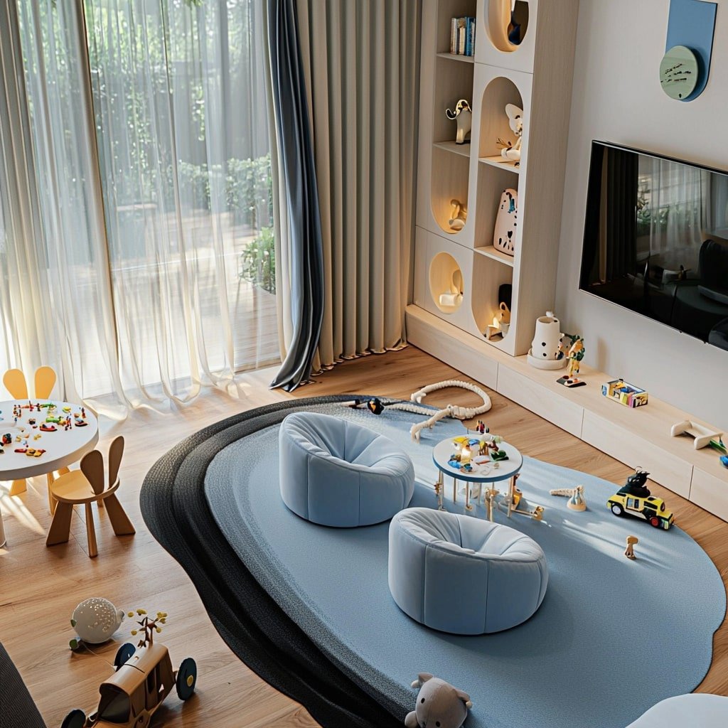 A calming blue playroom with plush chairs and a matching rug. A round table encourages play, while wooden shelves store toys stylishly. A TV and toy car add fun, blending minimalism with comfort for young children.