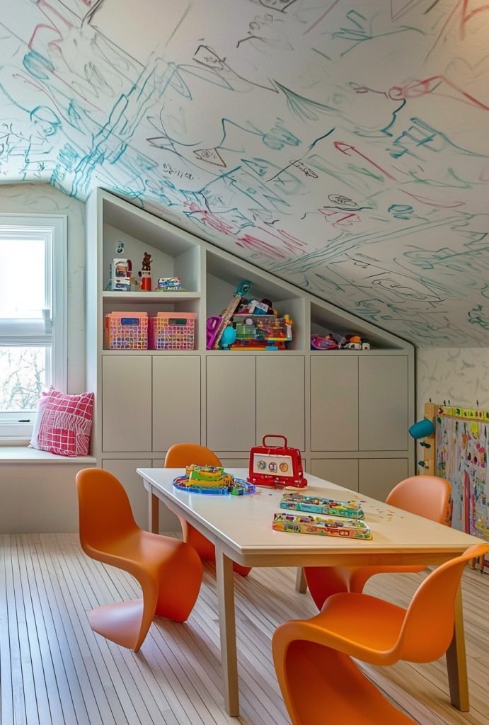 Unleash creativity in this vibrant playroom with a ceiling covered in colorful doodles. Bright orange chairs surround a central table, ideal for art projects or collaborative play. Built-in storage along the walls houses toys in pink and purple bins, keeping the space tidy.