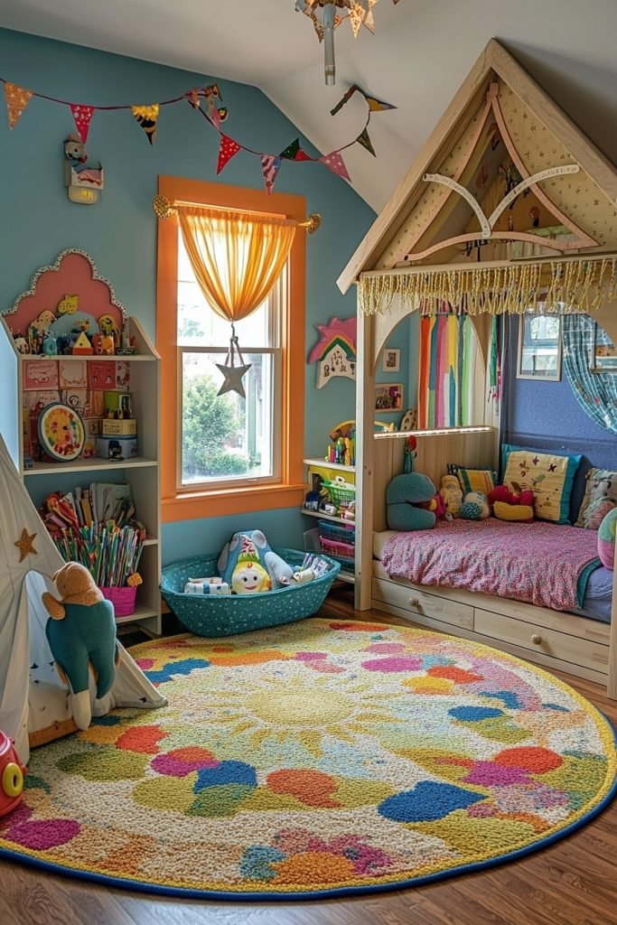 This boho-inspired playroom bursts with color and charm, featuring a vibrant rug with abstract patterns as its centerpiece. A wooden bed with a canopy adorned with rainbow curtains creates a cozy nook, while a teepee offers a hideaway for imaginative play.