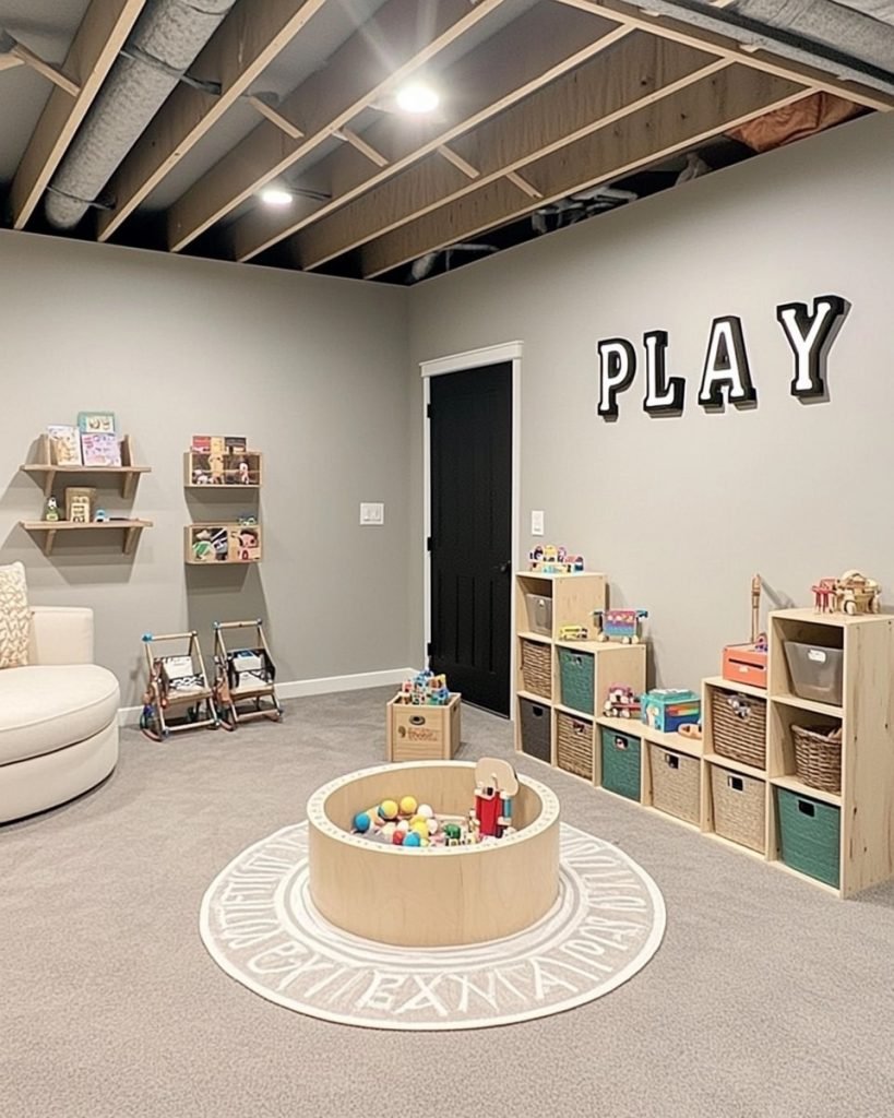 This organized playroom features wooden cubbies with woven baskets for toys. A round ball pit adds sensory fun, while a table encourages activities. The word “PLAY” on the wall and a sofa create a tidy, inviting space.