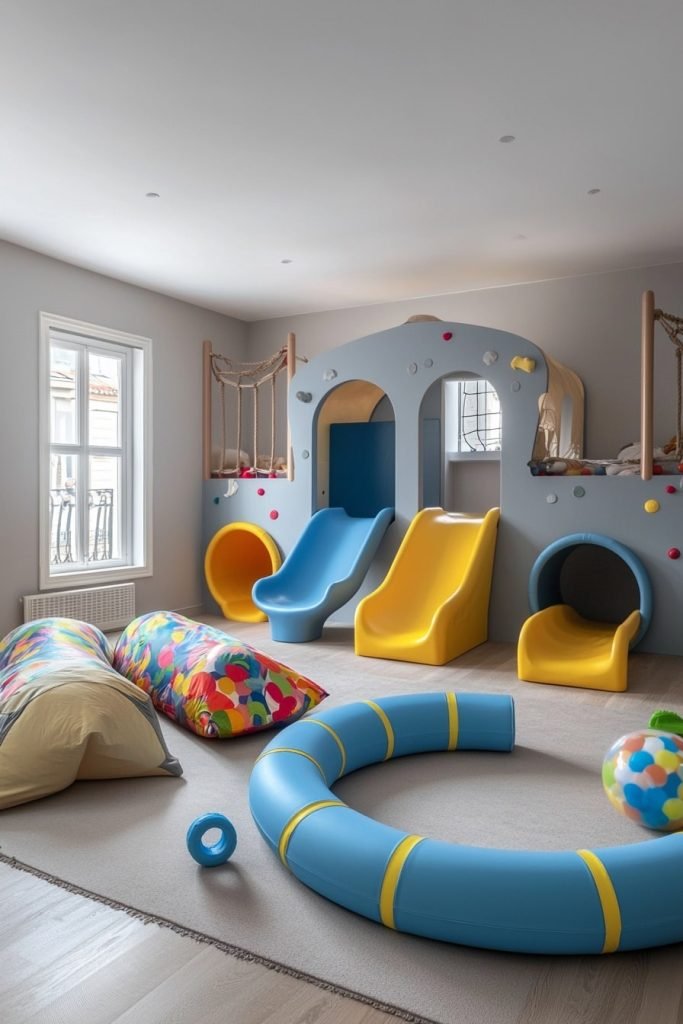 Turn your playroom into an adventure zone with built-in slides and tunnels. This setup features a custom structure with two slides—one blue, one yellow—alongside a tunnel for crawling fun. The soft, neutral walls keep the focus on the vibrant play elements, while large bean bags in playful patterns offer a comfy landing spot.