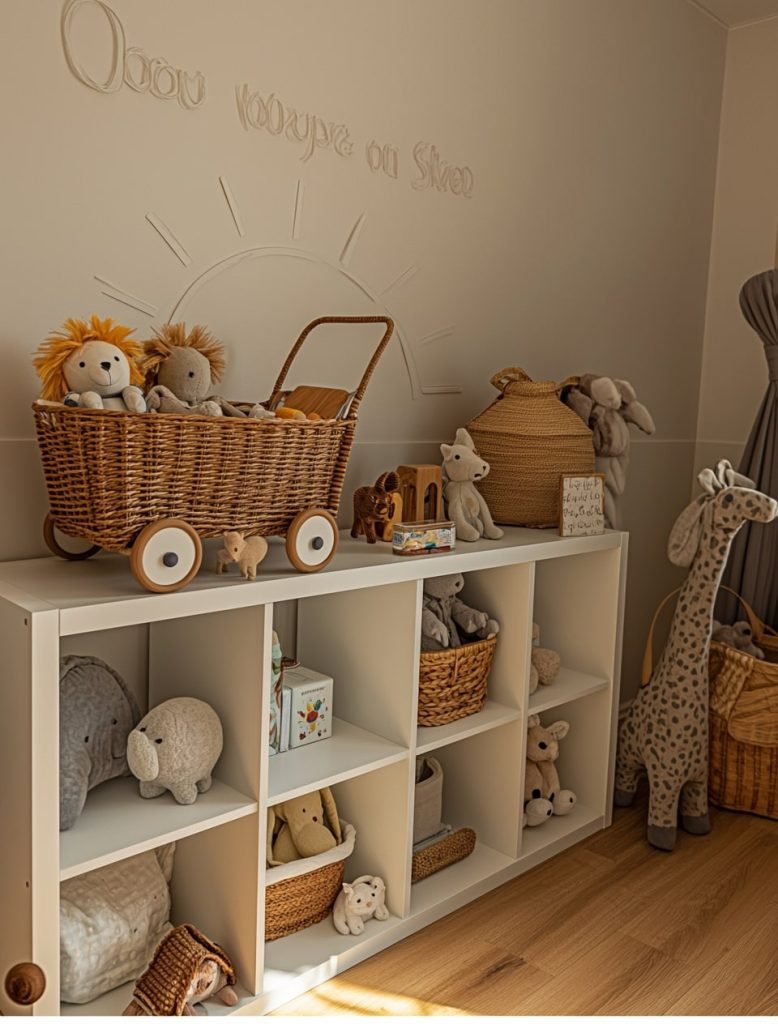 A cozy haven with white shelves and woven baskets for plush toys. A wicker wagon stores more toys, while a sunburst design on beige walls adds warmth. A tall giraffe plush brings playful charm to this tidy space.