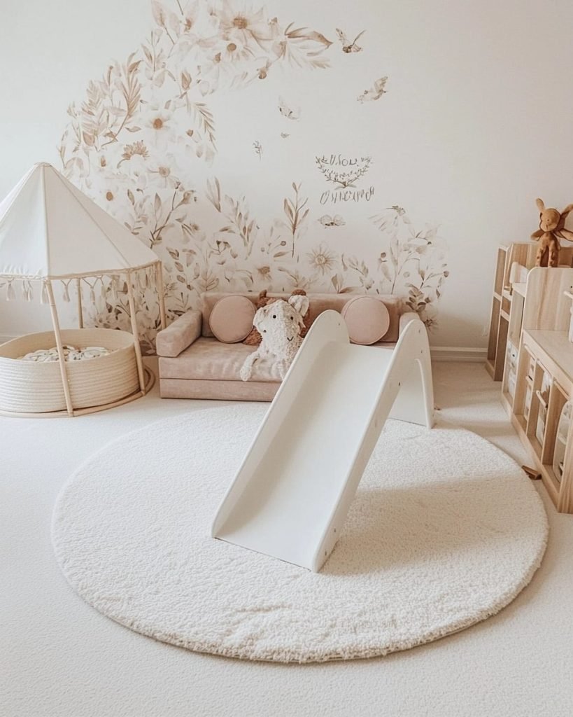 A floral-themed retreat with a delicate mural and white teepee. A small slide offers fun, while a plush sofa with cushions ensures comfort. Woven baskets and a fluffy rug create a serene, nurturing space for imaginative play.