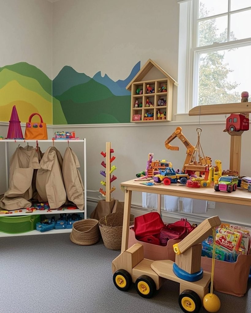 Fuel your child’s imagination with a construction-themed play station. This playroom features a wooden desk cluttered with toy vehicles, cranes, and building sets, encouraging hands-on play. A mountain mural on the wall adds an adventurous backdrop, while a small dollhouse shelf above keeps additional toys within reach.