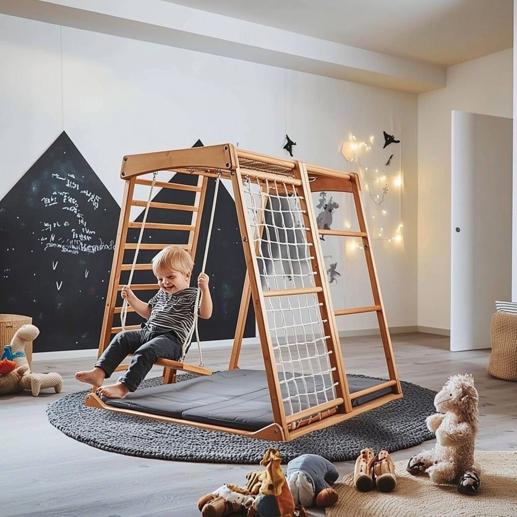 Bring the playground indoors with this playroom’s wooden climbing frame and swing. The triangular structure features a swing, rope net, and climbing bars, encouraging active play and motor skill development.