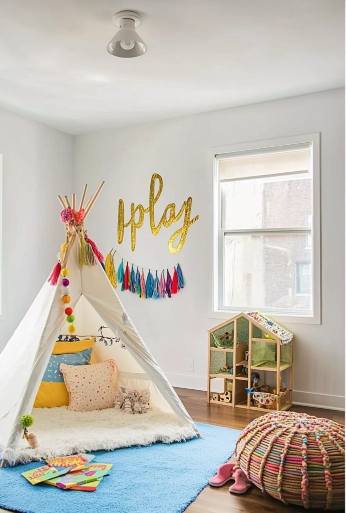 A festive playroom with a teepee adorned with colorful tassels. The word “PLAY” in gold letters sets a cheerful tone. A dollhouse and woven pouf add charm, while a blue rug creates a cozy spot for imaginative play.