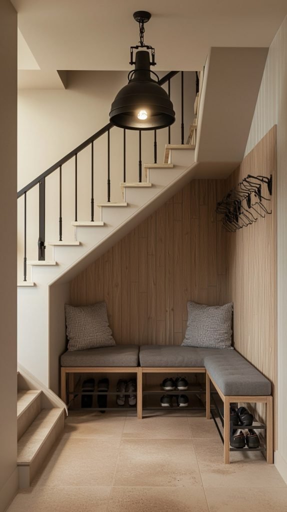 Incorporate a bench beneath the stairs with cubbies for shoes. The angled space is used efficiently, offering both seating and storage. Cushions add comfort, while the wooden finish blends with the staircase, creating a cohesive and practical design.