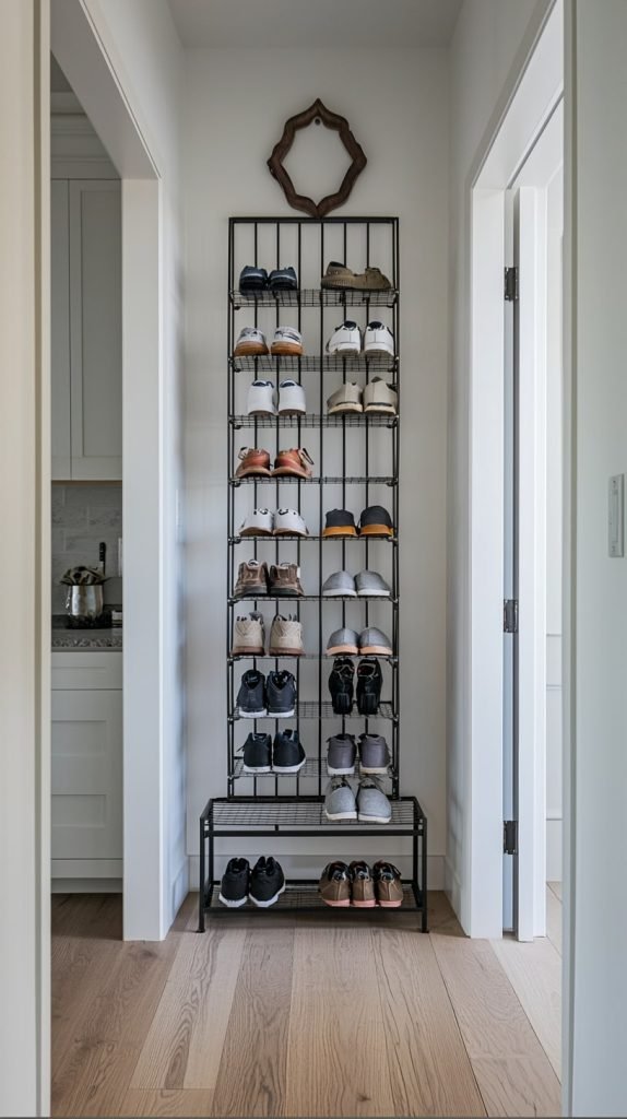 A tall wire rack fits neatly in narrow hallways, utilizing vertical space. Its open shelves can store a large collection, keeping shoes visible and accessible. This sturdy design is ideal for those with extensive footwear collections needing an organized display.