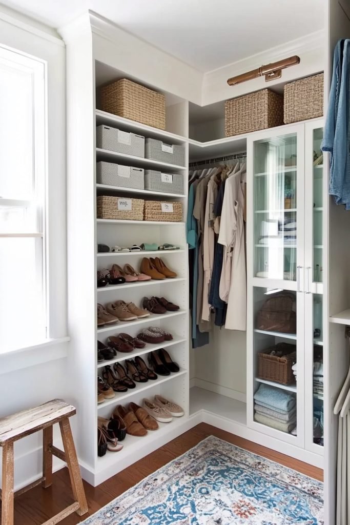 Incorporate open shelving into your closet for a streamlined look. The lower shelves store shoes, while upper ones hold folded clothes. This design keeps everything visible and organized, making it easy to find the perfect pair in a hurry.