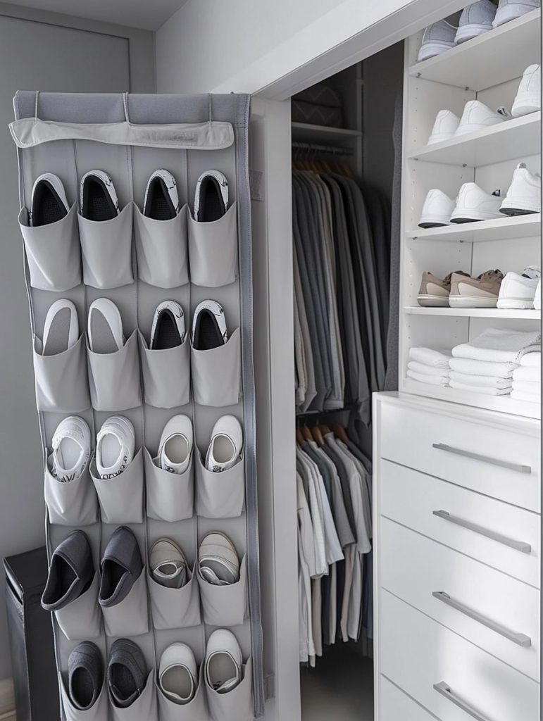 A hanging organizer on the back of a closet door offers a space-saving solution. With multiple pockets, it can hold several pairs of shoes, keeping them off the floor. This is perfect for small closets, ensuring easy access without clutter.