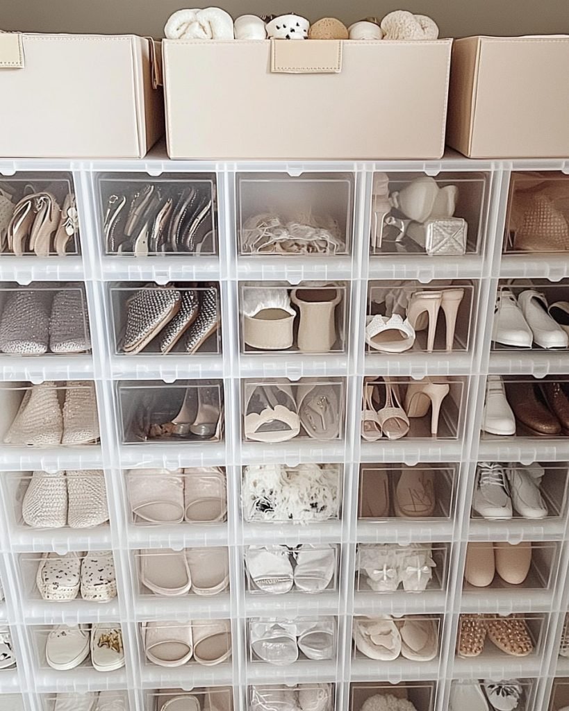 Clear plastic bins stack neatly to store shoes while keeping them visible. Each bin holds a pair, protecting them from dust and damage. This solution is great for collectors, offering a tidy and accessible way to organize a large collection.