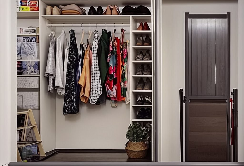A closet with built-in side shelves maximizes space for shoe storage. The narrow shelves hold pairs vertically, keeping them organized alongside hanging clothes. This setup is ideal for small closets, ensuring every inch is used efficiently.