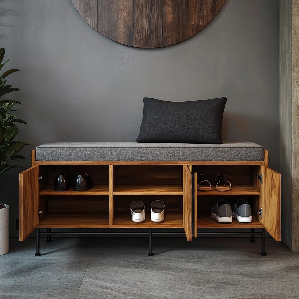 This modern bench features enclosed cabinets, keeping shoes out of sight. The cushioned top provides seating, while the hidden compartments maintain a tidy look. It’s a sleek option for those who prefer a minimalist aesthetic with practical storage.