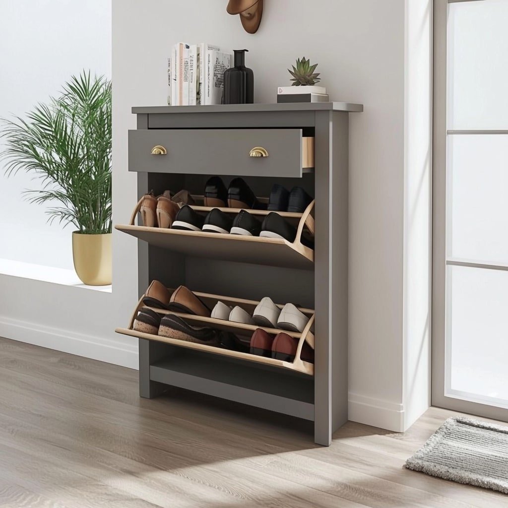 A slim, grey cabinet with pull-down shelves keeps shoes neatly stored. The top drawer is perfect for small items like keys, while the tilting compartments below hold multiple pairs. This compact design fits small entryways, maintaining a clean and organized look.