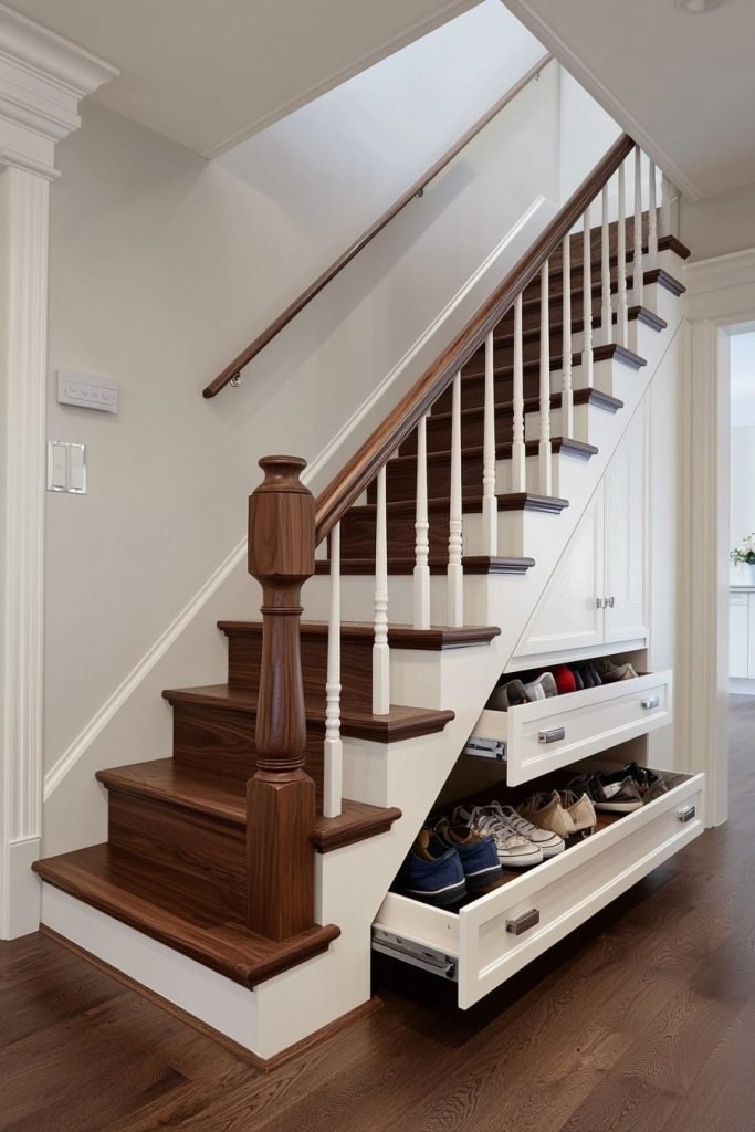 Maximize unused space with pull-out drawers beneath the stairs. These deep compartments can store multiple pairs, keeping them hidden yet accessible.