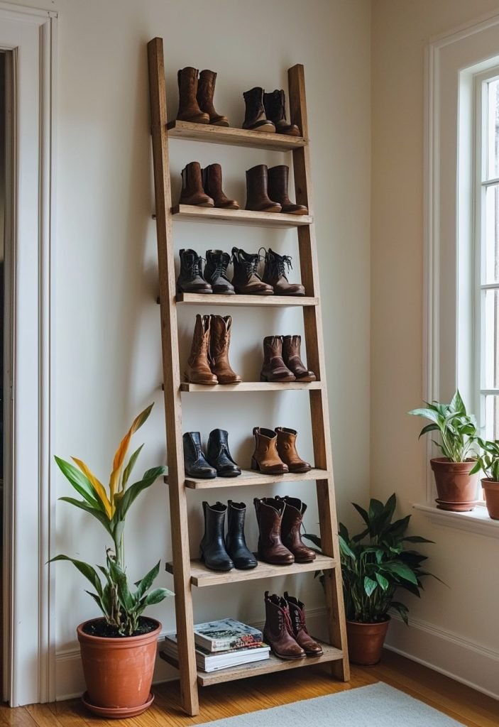 A wooden ladder-style rack leans against the wall, offering a rustic charm. Each slanted shelf holds a pair of shoes, maximizing vertical space. This solution works well in tight corners, blending seamlessly with plants or decor for a cozy vibe.
