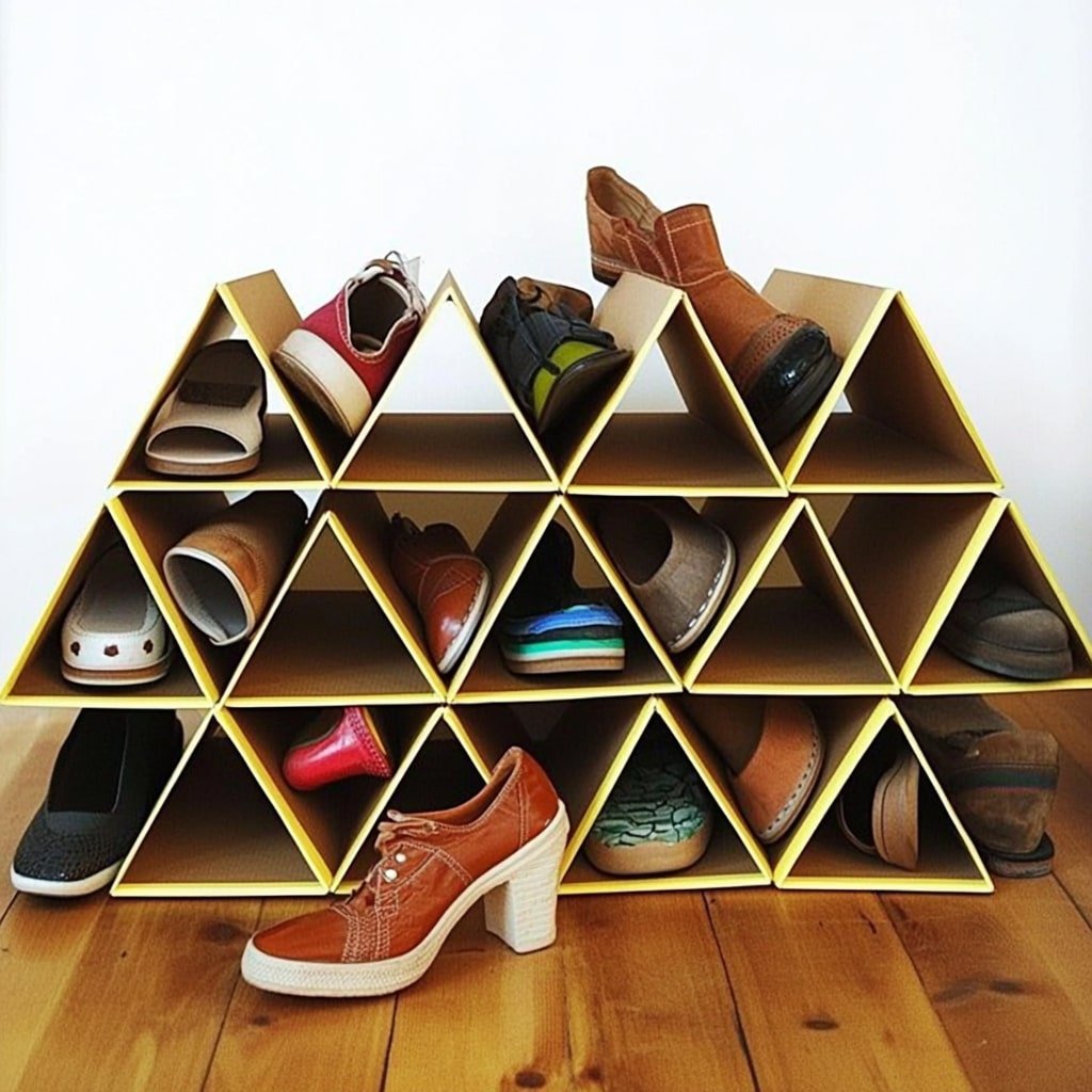 For a budget-friendly and creative option, this triangular cardboard shoe organizer stands out. Crafted from sturdy cardboard with yellow trim, the triangular compartments form a visually striking pyramid shape.