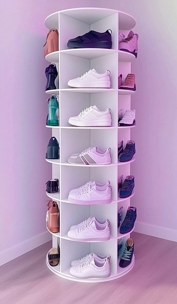 This tall rotating shoe tower is a space-saving marvel for small rooms. Its cylindrical design features multiple semi-circular shelves that rotate, allowing easy access to every pair. From sneakers to heels, each shelf holds a variety of shoes, while the top can store bags or accessories.