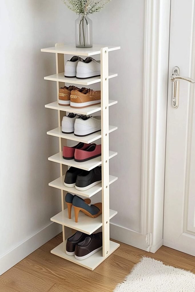 Perfect for tight spaces, this narrow vertical shoe rack features multiple white shelves to hold various shoes, from sneakers to heels. The light wood frame adds a touch of warmth, and the top shelf doubles as a display for decor, like a vase with dried flowers.