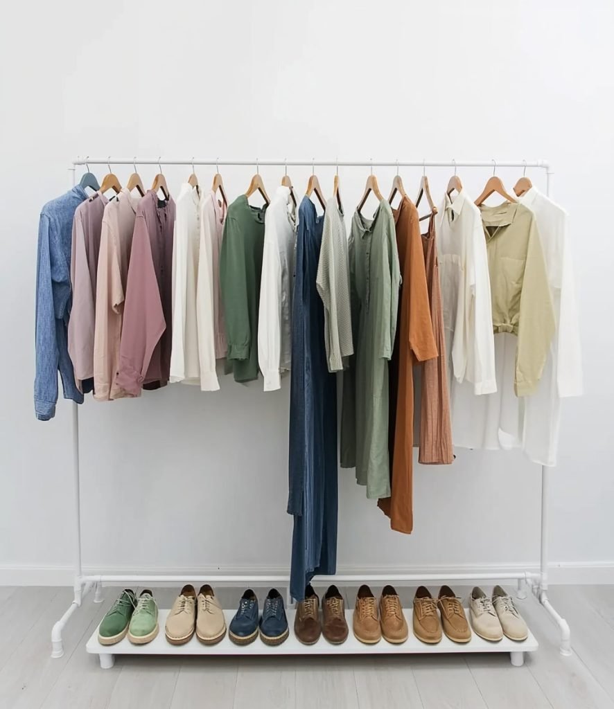 This minimalist clothing rack combines a hanging rod for clothes with a lower shelf for shoes, creating a cohesive storage solution. The white metal frame supports a variety of shirts and dresses in soft, neutral tones, while the bottom shelf neatly organizes several pairs of shoes, from sneakers to loafers.
