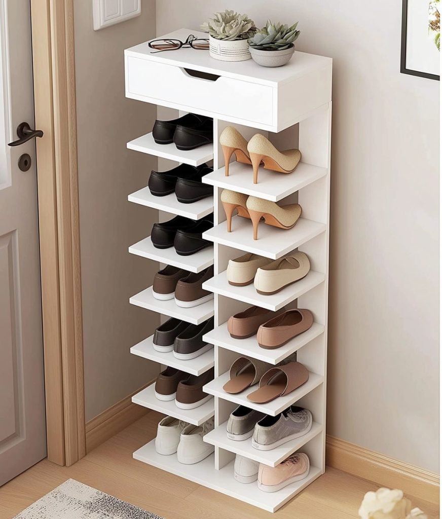 A tall white shoe rack with a drawer and open shelves organizes shoes in narrow spaces. The top displays plants and accessories, blending practicality with a sleek, modern look, ideal for contemporary entryways with limited room.