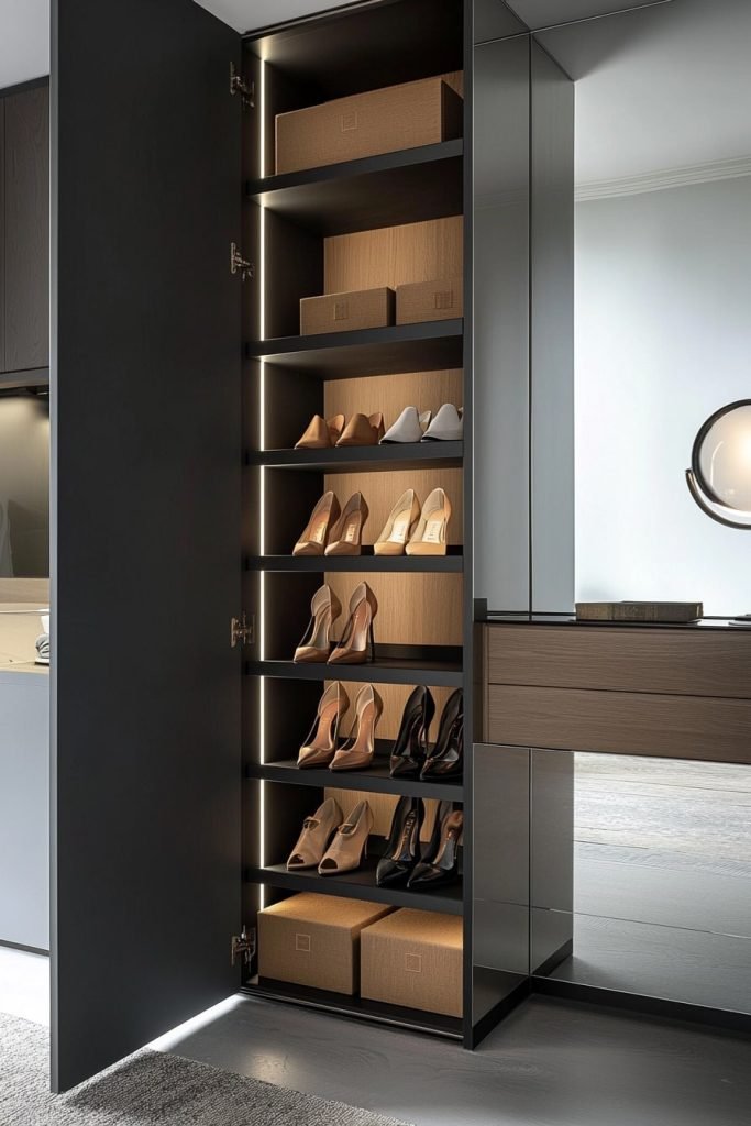 A sleek closet shoe cabinet with built-in lighting highlights heels on shelves. The black and wood finish, paired with a mirrored exterior, creates a luxurious feel, perfect for upscale closets with a modern, high-end storage solution.