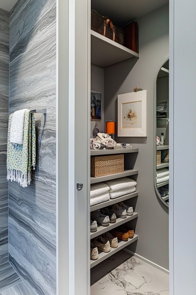 This compact closet with grey and marble interiors features built-in shoe shelves, towel storage, and baskets. A round mirror adds utility, making it a streamlined, modern solution for small spaces needing efficient, stylish organization.