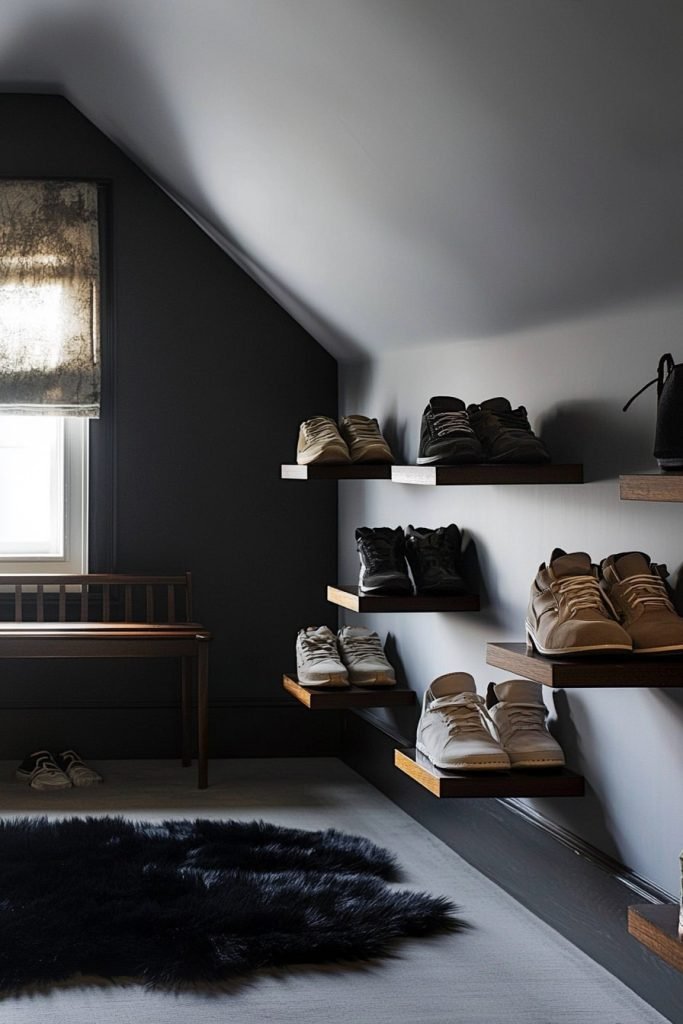 Floating wooden shelves in a cozy corner display sneakers against a dark wall. A bench and rug add warmth, while the minimalist design saves space, ideal for small rooms or attics with a chic, modern touch.