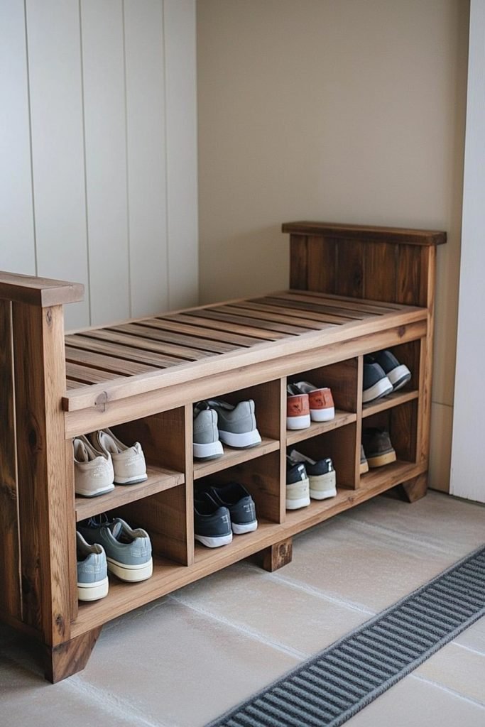 A rustic wooden bench with open cubbies below offers a cozy entryway solution. Its slatted seat provides a spot to sit, while the natural wood finish adds warmth, keeping shoes organized and accessible in a charming farmhouse style.