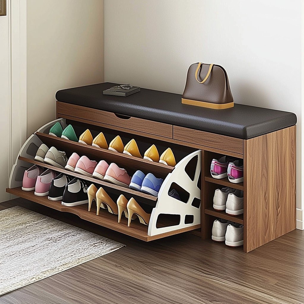 This wooden bench with pull-out compartments is a game-changer for entryway organization. The cushioned top offers a comfy seat, while the pull-out drawers below reveal cleverly designed shelves for shoes.