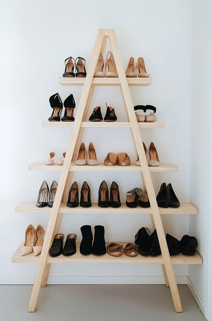 This ladder-style wooden rack features tiered shelves in an A-frame design, ideal for small corners. The light wood finish suits minimalist interiors, keeping shoes ventilated and accessible while doubling as a stylish display for your collection.