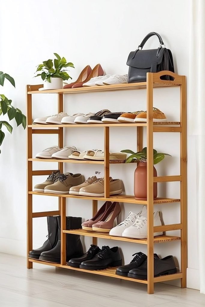 A multi-tiered bamboo shoe rack offers sustainable storage with open shelves for various footwear. The natural finish adds warmth, while the top shelf holds decor, making it a versatile, eco-friendly choice for entryways or bedrooms.
