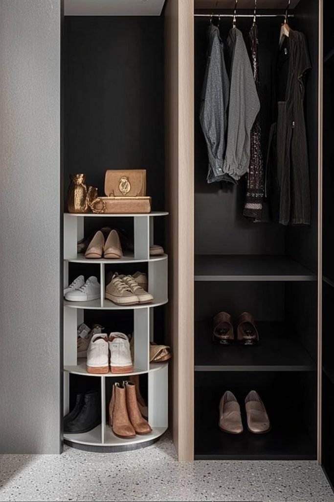 A rotating circular shoe rack fits snugly in a closet corner, with white semi-circle shelves for easy access. Its vertical design maximizes space, holding sneakers to boots, while the top shelf stores bags, perfect for small closets.