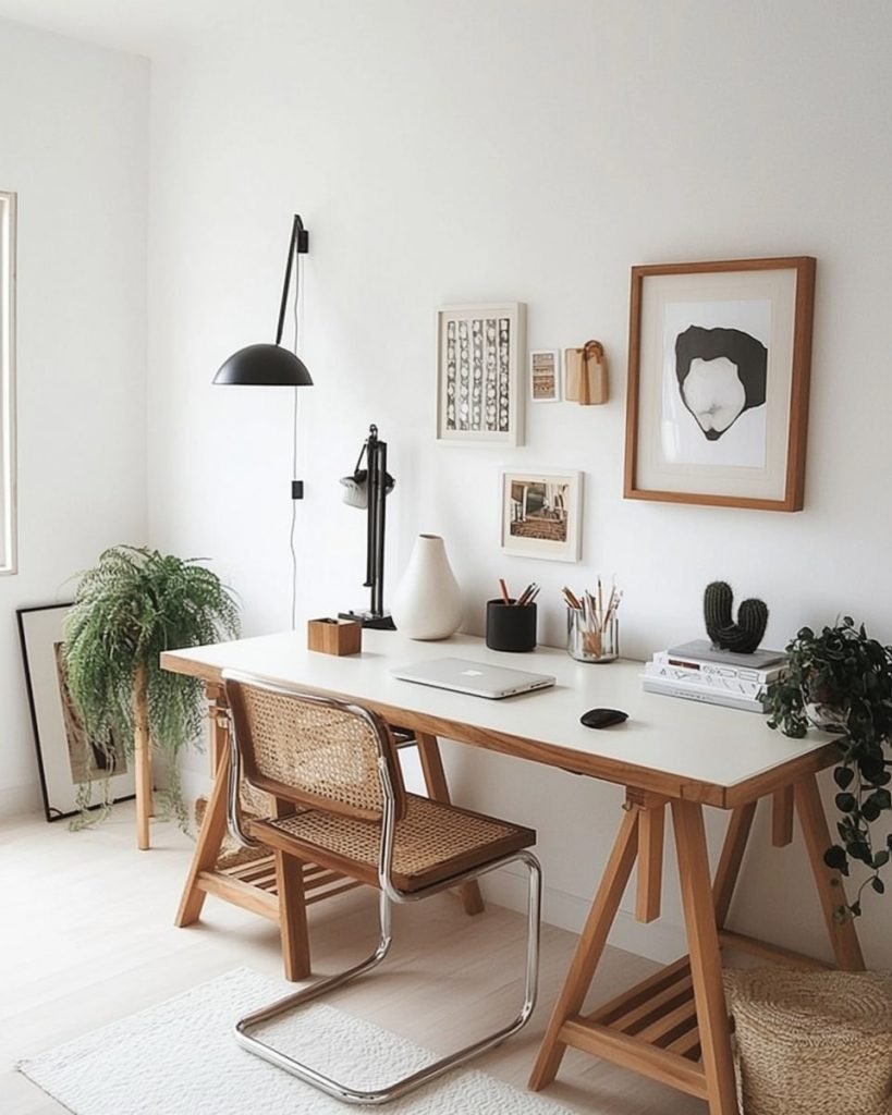 A woven chair and wooden desk bring warmth to this bright office. White walls and large windows amplify natural light, while plants and framed art add personality.