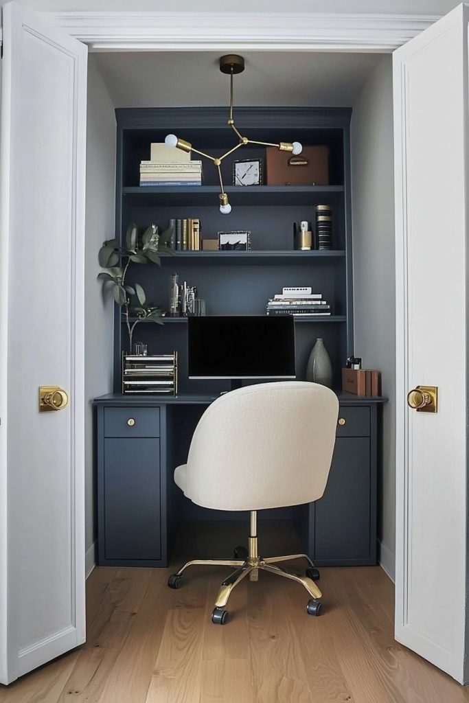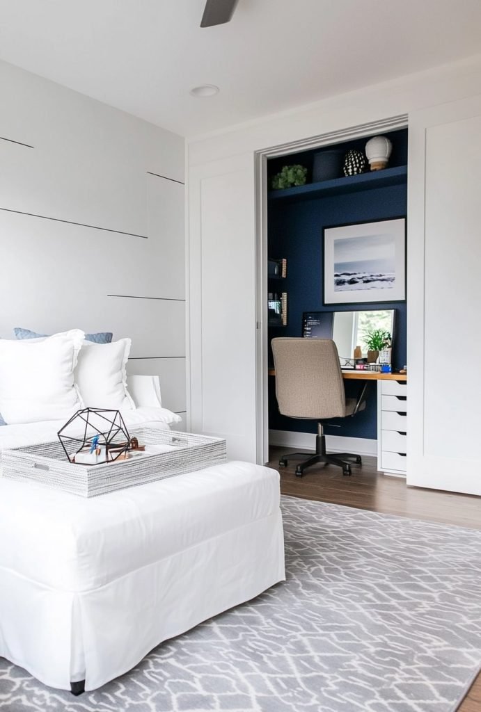 This clever closet-turned-office features a navy blue accent wall, creating a striking contrast with white cabinetry.