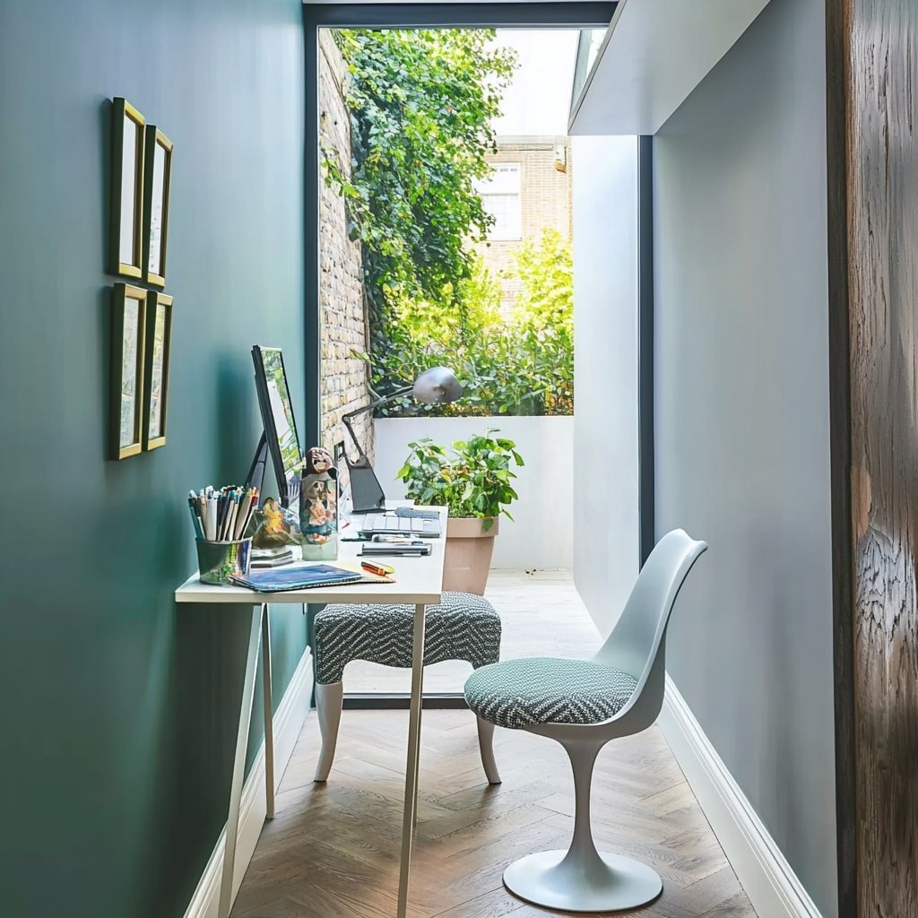 This narrow office features a white desk against a teal accent wall, paired with a modern chair with a patterned cushion.