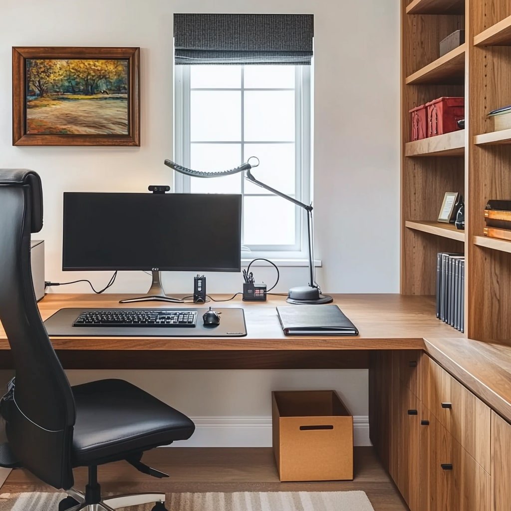 This classic office features a wooden L-shaped desk, paired with a black ergonomic chair. Open shelves hold books and red storage bins, while a framed landscape painting adds warmth.