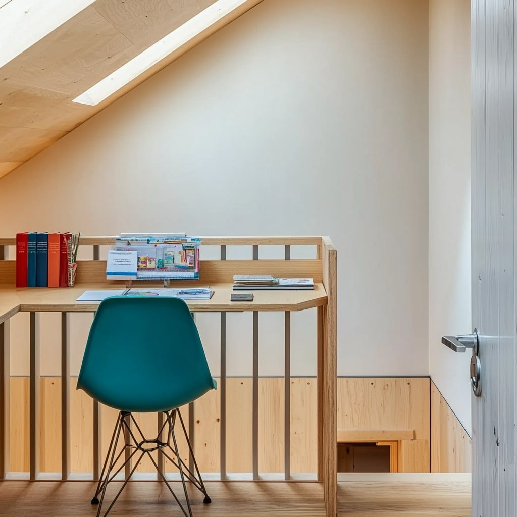 Tucked into a loft with a sloped ceiling, this office features a wooden desk with a vibrant teal chair.