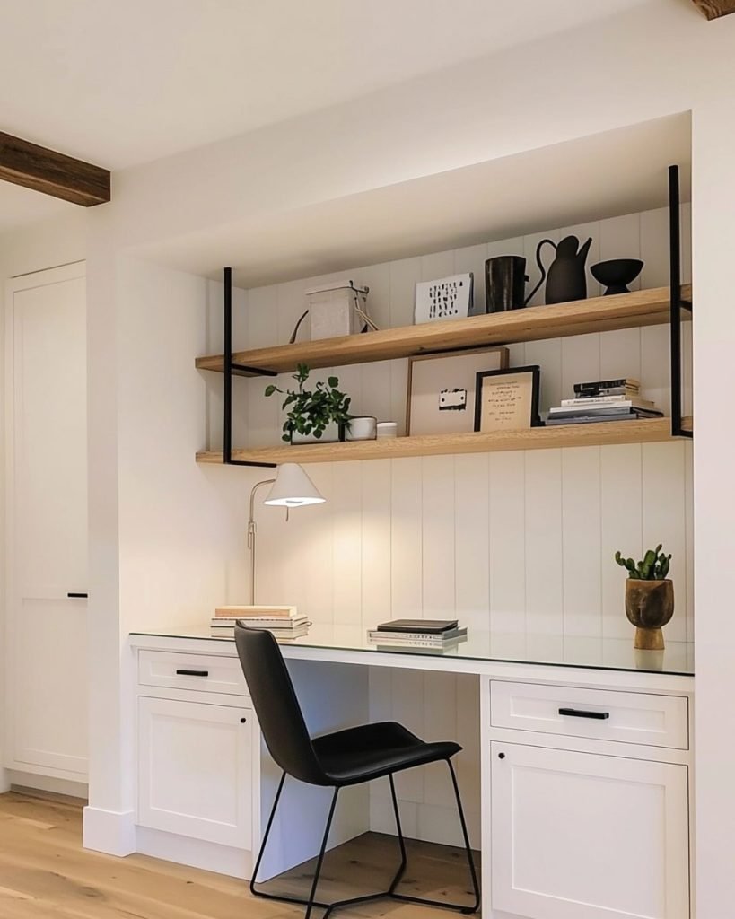 Open shelves above the desk hold books and plants, creating a cozy vibe. A plush white chair on casters ensures mobility in this efficient, stylish setup.