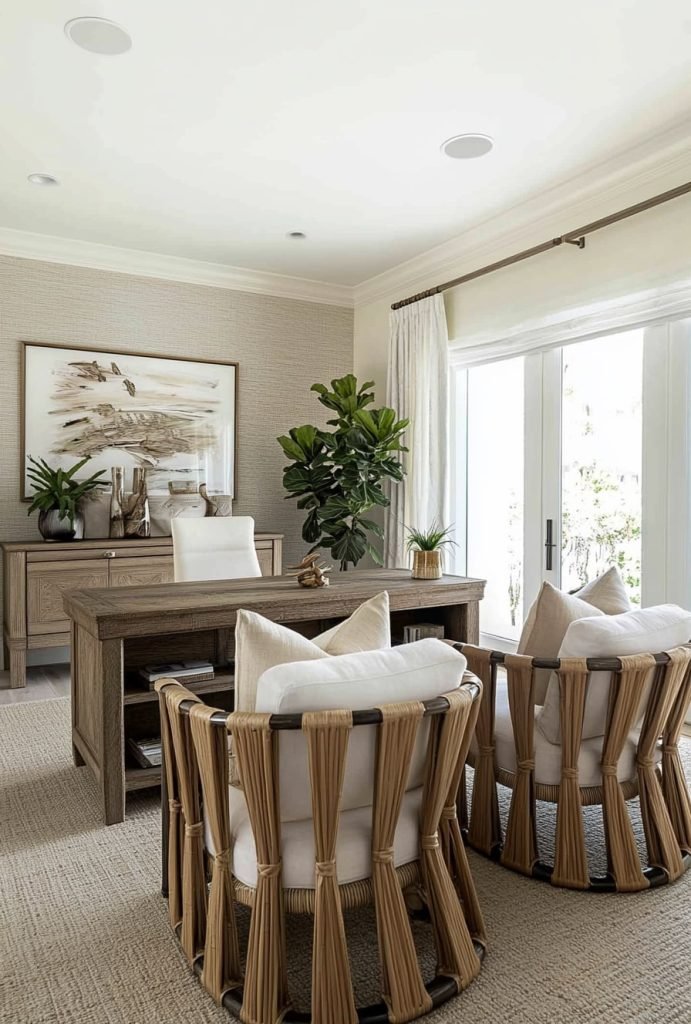 Set against large windows, this office features a wooden desk with a woven chair, blending modern and natural elements.