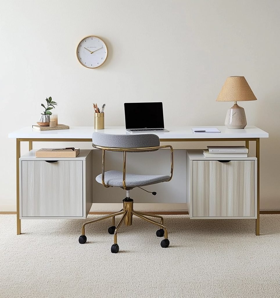 A gold lamp adds warmth, making this a bright, airy workspace.