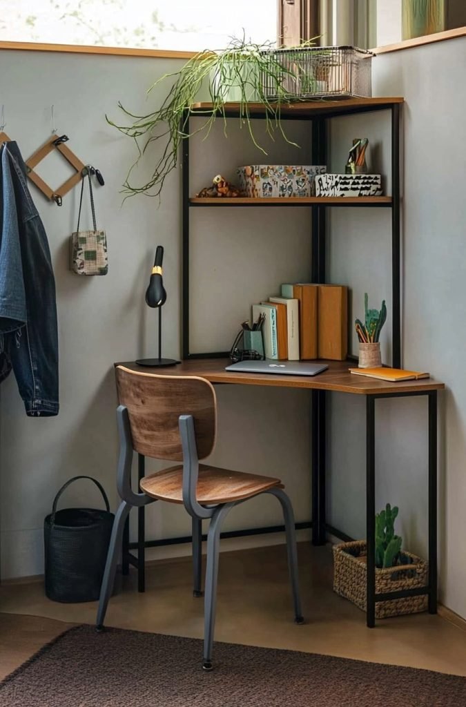 A gray chair pairs with the desk, while books, plants, and decor fill the shelves. A hanging plant and jacket hooks add a cozy, lived-in feel to this efficient workspace.