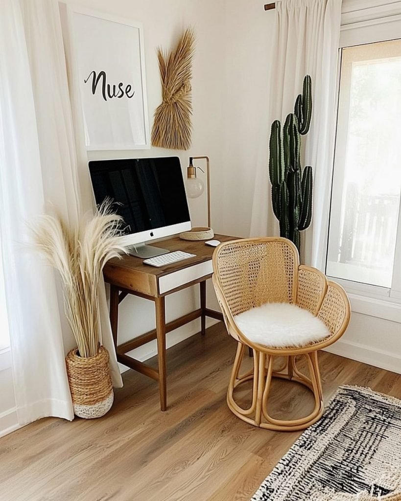 Pampas grass, a cactus, and framed art with the word “Muse” create a boho vibe. Sheer curtains and natural light enhance the relaxed, creative atmosphere of this office.