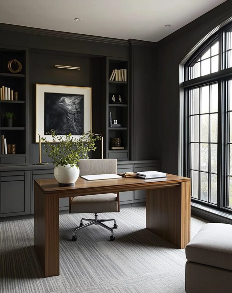 Dark gray walls create a dramatic backdrop for this refined office. A wooden desk anchors the space, paired with a neutral chair.