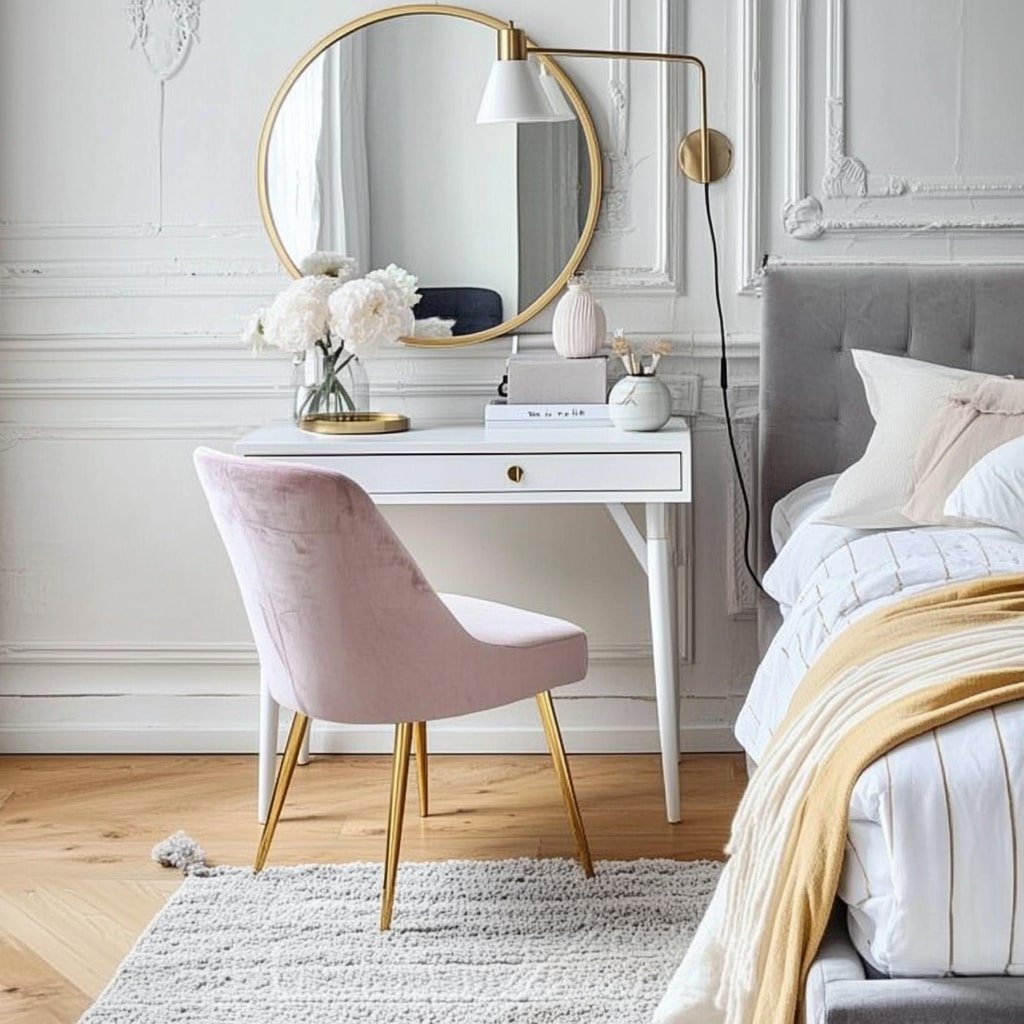 This chic office, set in a bedroom, features a white desk with a pink velvet chair accented by gold legs. A round mirror, brass sconce, and fresh flowers create a luxurious feel.