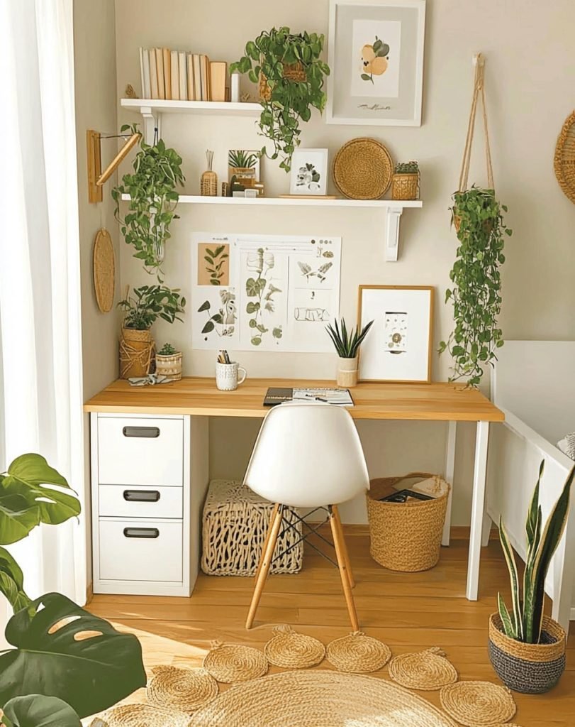 A wooden desk with a white chair sits on a woven rug, while botanical art and woven baskets add texture. The abundance of greenery and natural light creates a fresh, earthy workspace.